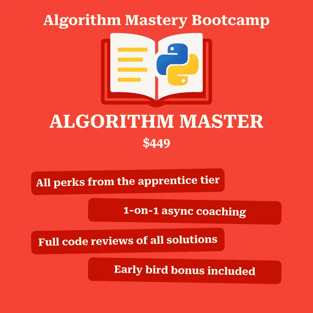 However, if you're serious about upskilling, developing your self-sufficiency as a Python programmer, and deepening your understanding of Python best practices, algorithms, and data structures, you can also join as an “Algorithm Master”: